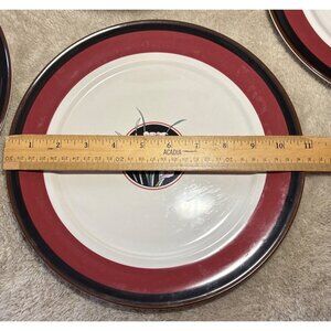 A set of six dinner plates featuring a floral design with vibrant red borders. Durable, microwave and dishwasher safe for effortless meal preparation and cleaning.