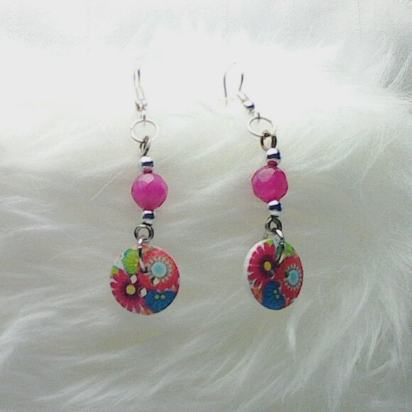 No. 1801 Pretty handmade earrings with half-inch diameter buttons and small matching colored hand made glass beads