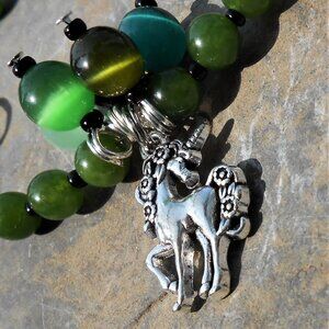 No. 2 Handmade bracelet with unicorn charm in Tibetan silver, 6mm polished stones and 8mm cat's eye stones