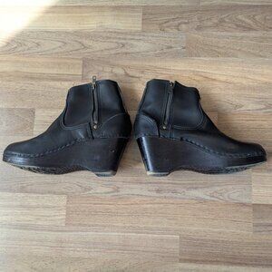 No. 6 Store clog boots in good used condition. These handcrafted leather boots feature the brand's signature clog base with a buckle detail and classic silhouette. Each pair shows unique characteristics due to their handmade nature, making them truly one-of-a-kind.