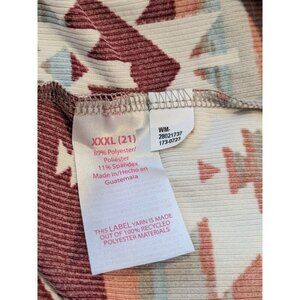 This product is a No Boundaries Aztec print women's long sleeve ribbed shirt in size XXXL (21). It features a round neck, pullover closure, and a casual sleeve design. Made of polyester and spandex knit fabric, this multicolor shirt is lightweight, stretchy, and breathable, making it suitable for all seasons. The Aztec print gives it a boho and colorful Western style, perfect for a casual occasion in the fall, spring, or summer. Easy to care for with machine washable instructions. Measurements (approximate, laid flat, one side, double to go all way around where applicable)