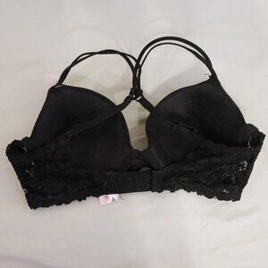 This listing is for a Black Lace Frame T-Shirt Bra, Size 32D, made by No Boundaries. This item is New With Tags, never worn. Lace has a floral pattern. Cups are made of 89% nylon, 11% spandex. Lace is made of 92% nylon, 8% spandex.