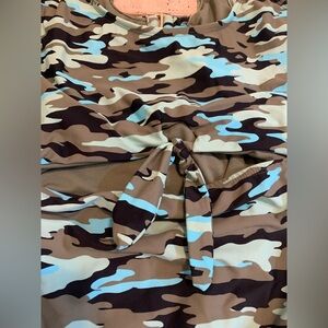 The unique camouflage pattern includes shades of green, black, and light blue, offering a modern twist on a classic print. It features a stylish front tie knot detail that creates a flattering cut-out design, adding a chic element to the look. The back also includes an open cut-out for added appeal.