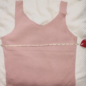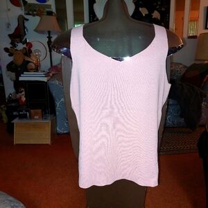 Can't go wrong with a soft pink top. So many cardigans can be paired with it, such as white and black. Wearable for all seasons. Classic pretty look. Sleeveless. No size or label attached. Approx 17" across chest should fit size Medium. Nice stretch. Soft knit.