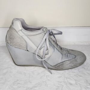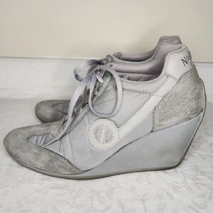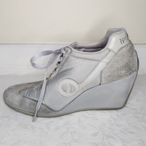 Grey on Gray Suede Leather & fabric High Wedge Heel Laceup Round Toe Sneakers, by NO NAME.