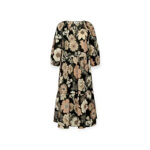 - Features: Hand drawn floral print, V-neck, voluminous waist