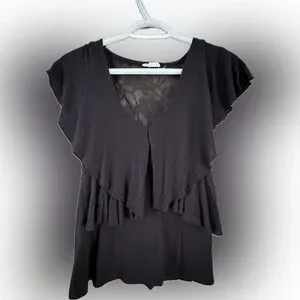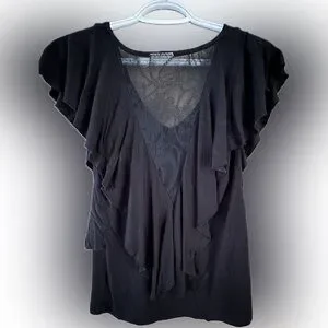 Elegant black top with ruffle details. V-neck design. Perfect for casual or formal wear. This shirt has gorgeous lace detail in the back. Great versatile option to add to any wardrobe.