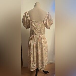 Sweet and sexy Nobo Floral Milk Maid Dress with Puff Sleeves. Delicate floral pattern, smocked back, drop elastic waist and faux buttons down the front (they don’t undo)