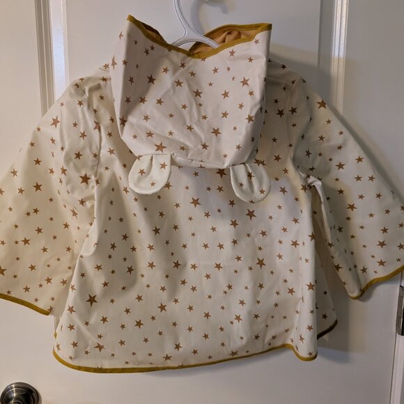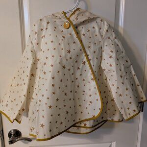 Nobodinoz brand rain cape with hood and button closure. Beautiful star pattern, purchased in Europe but my kids never wore them. I have a size 4T and 6T.