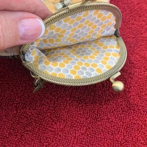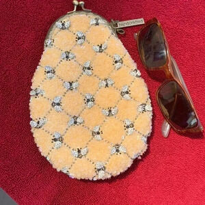 Swarovski crystals and iridescent sequins sparkle in the light. The grid pattern is done in gunmetal beads. The interior is lined with cotton in a honeycomb pattern and there are lovely positive messages on the back.