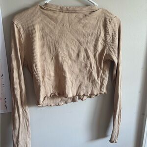Soft ribbed knit cropped top with a flattering V-neck and functional button-front. Lightweight long sleeves and subtle lettuce-edge hem for a feminine finish. Versatile beige color that pairs easily with jeans or skirts. Brand is Noisy May