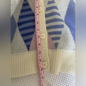 Chic cardigan with geometric design. Features cream, blue, green, and pink hues. Ideal for a stylish funky look.