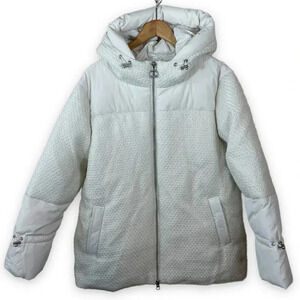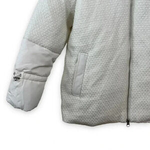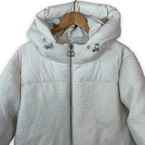 A gorgeous way to stay warm this winter - the Minka Puffer Coat from Noize. Mixed media with woven ivory tweed adding eye catching texture. Hooded. Two way zip closure. Front slant zip closure pockets. Adjustable fit to keep you cozy - drawstrings at hem, back of the waist, cuffs and hood. Vegan. Rated to keep you warm to -30C. 30" length.