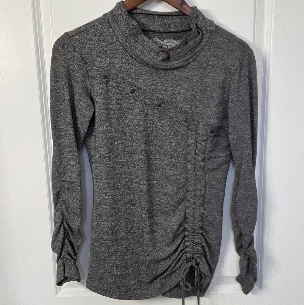 Excellent condition. Very soft organic cotton/hemp blended fabric with a touch of spandex to allow a little bit of stretch with your movements. Very unique asymmetrical design.