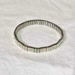Style: Features a classic stretch design with interlocking, polished metal links. Some links are embellished with small, clear rhinestones.