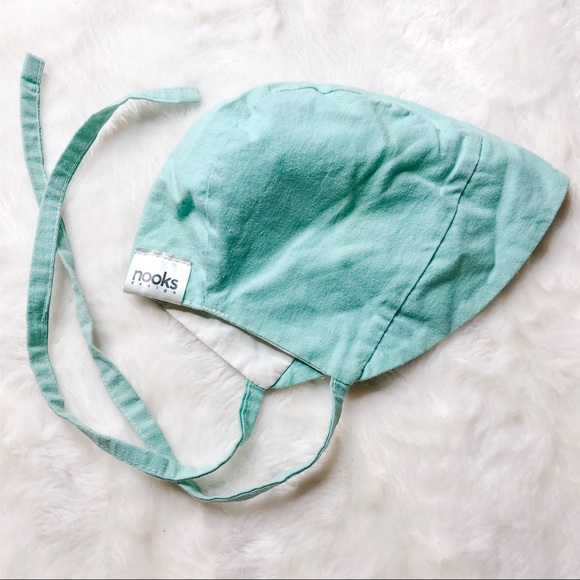 Nooks brand linen bonnet with tie straps. No size on tag but I believe it is 6-12M size