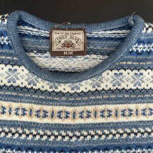 Nordic-style pullover sweater in blue and cream tones with intricate geometric patterns.