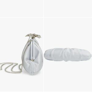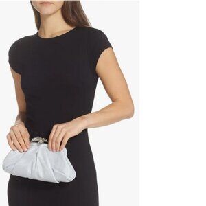 A shimmering, crystal-embellished flower clasp secures a glamorous minaudére with a drop-in chain strap for hands-free carry.