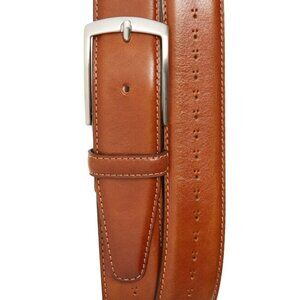 Classic broguing details a smooth, stylish leather belt crafted in Italy and secured by a shining buckle.