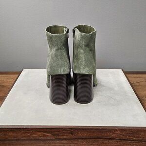 These green suede ankle boots feature a chic square toe and a convenient inner side zip closure for effortless wear. Standing on a sophisticated 3.5-inch wood heel with a durable synthetic sole, they offer both style and stability.