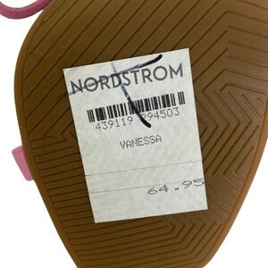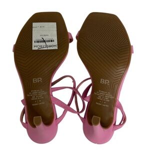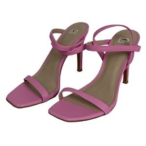Nordstrom BP Vanessa Sandals in Pink Begonia and Women's Size 6.5. Retails for $64.95 USD (approximately $91 CAD). Slim straps distinguish a minimalist sandal lofted by a tapered heel for a style that will flawlessly complement your trendsetting looks. 4" heel. Synthetic upper and lining / rubber sole. Made in China. Brand new with tags but note there is small nick on back - see photos.