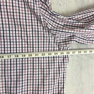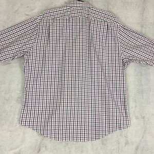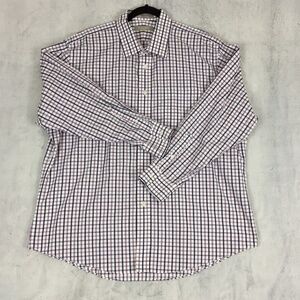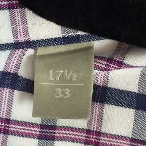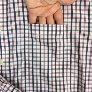 Men's Tag Size 17.5 / 33. 100% cotton. White, blue and purple windowpane plaid. Reinforced collar and cuffs. Single button barrel cuff. Chest patch pocket. Curved hem. Shoulder pleats. Full button front, long sleeves.