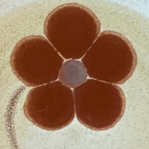 🌺 5 Noritake Folkstone stoneware bowls are a style of dinnerware known for their durable, opaque, and thicker build, with a stone-like appearance. The bowls in the image feature a speckled cream background with a central flower design. The flower has deep red petals and a brown center, with green leaves and a stem. This particular style was popular in the 1970s. This pattern within the Noritake Folkstone line is called "Happy Time." The bowls are dishwasher safe and were made in Japan.
