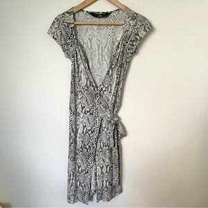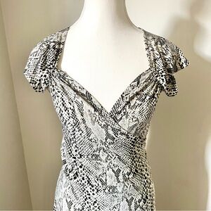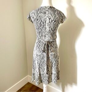 Print Jersey Wrap Dress Size Medium. Short cap sleeves with sweetheart wrap neckline. Snakeskin printed stretch jersey fabric. True wrap dress. Size medium. Excellent condition.