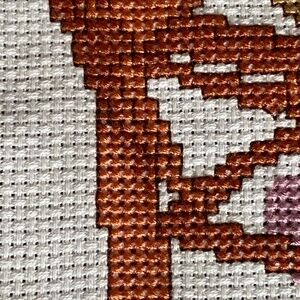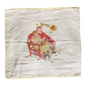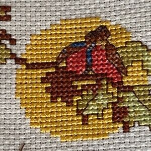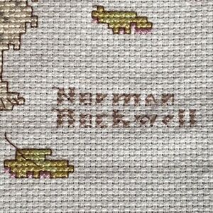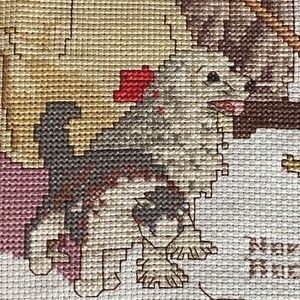 Norman Rockwell vintage cross stitch. Couple with animals on loveseat