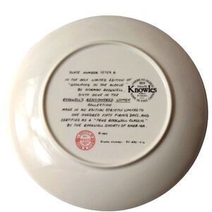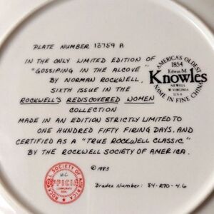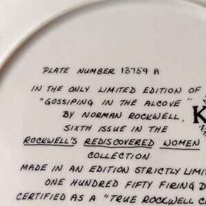 Here's a classic Rockwell collector plate entitled "Gossiping in the Alcove." Issued in 1983, sixth issue in the Rediscovered Women Series. Approved by the Rockwell Society of America and crafted by Knowles China in an edition strictly limited to a maximum of 100 firing days. Numbered 13759 and signed. It's 8 1/2" diameter and in excellent condition. Comes with original box and certificate and a Van Hygan & Smythes Round Circular Wooden Plate Frame.