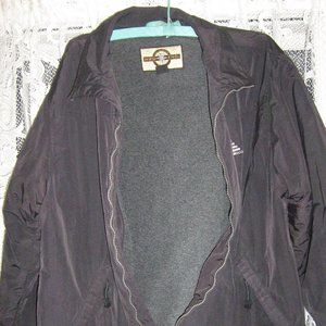 Men's jacket all climate wear. The jacket has a front zipper closure, and two pockets at the front with zipper closures. There is a logo on the top left hand side of the jacket (front) that reads WCOS. There is an elastic toggle cord at the bottom of the jacket inside for a snug fit. The sleeve cuffs have velcro strips for tightening. The jacket is nylon with a fleece polyester lining for warmth. This item is machine washable.
