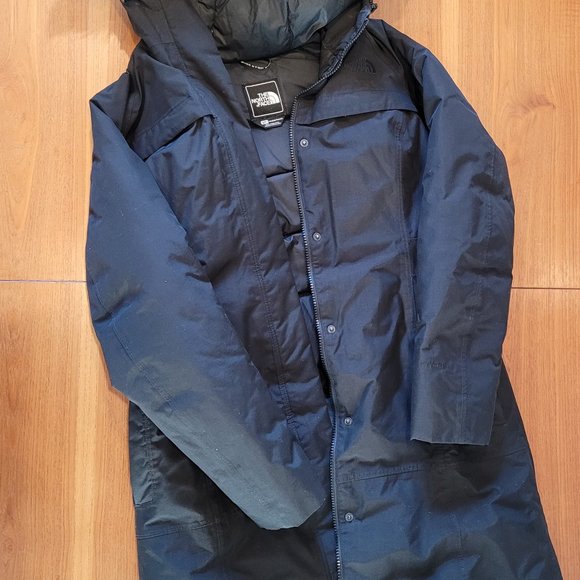 Nearly new - worn a handful of times black women's size small North Face women's parka jacket. It has a faux fur lined hood and the coat is super warm. I have too many jackets. My loss is your gain. This jacket is in great condition 9/10 condition. Comes from a smoke free home. This is machine washable and super easy to care for. Looks black and by the tag on the inside you can see the condition, hardly any wear.