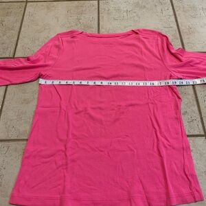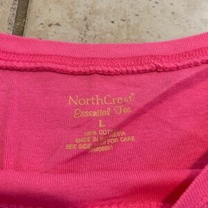 This is a vibrant pink, three-quarter sleeve top from NorthCrest's Essential Tee collection. The top is made from 100% cotton, offering a comfortable and breathable fit. It is a size large.