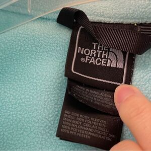 This cozy and stylish North Face fleece hybrid jacket features a soft light blue fleece body with a quilted lime green front panel for added warmth and wind resistance. Designed with a full-zip closure, zippered pockets, and a high collar, it's perfect for layering during outdoor adventures or casual wear. The jacket offers lightweight insulation while maintaining breathability and comfort. Ideal for cool weather outings!