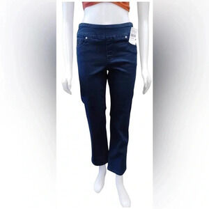 " Comfort Ankle" these dark wash jeans are very stretchy and fit all body types. The pants feature a five pocket design.