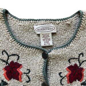 Vintage Northern Reflections beige knit cardigan has leaf embroidery at the front of shoulders and cable-knit pattern on the front of body (back of cardigan is plain knit). Metal button front closures with small metal leaf charm at bottom left hip edge. 40% cotton/60% acrylic, tag says hand wash. Made in China. Pre-owned condition: cardigan has some pilling from normal wear. The pictures show the actual item that you will receive. Tag size "XL", see below for garment measurements.