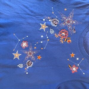 Vibrant blue with floral and celestial design on the front and left sleeve