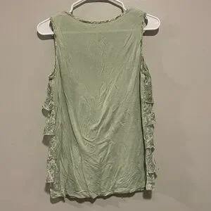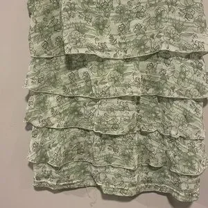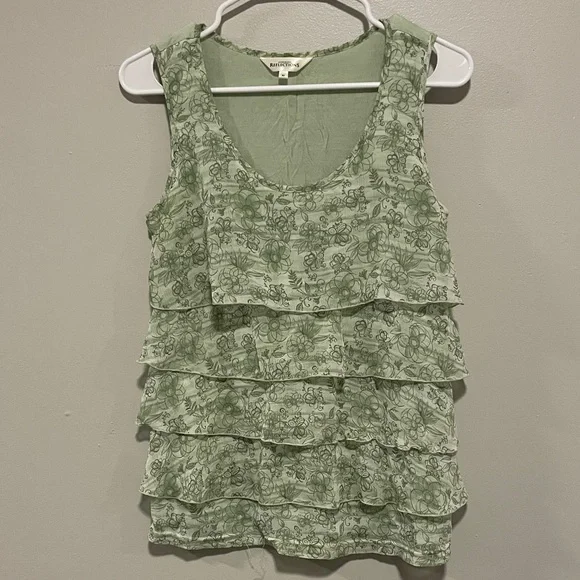 Stylish green tank with floral design. Features layered ruffles. Perfect for casual outings.