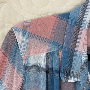 Northern Reflections Plaid Button Up Shirt. Women's tag size XXL (see photos for measurements). 100% viscose - relaxed, draping fabric. Blue and pink plaid. Gathered shoulders. Single button cuff with roll tab sleeves.