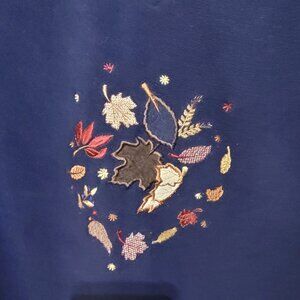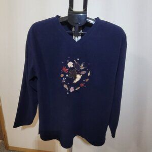 Lovely V-neck polar fleece pullover with embroidered and appliqued leaves on front and on back of neck