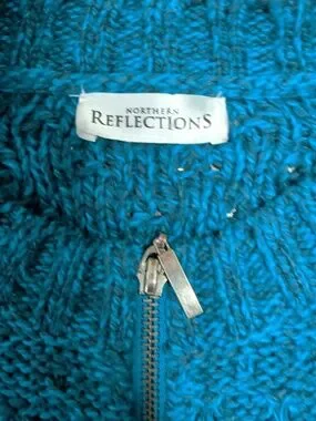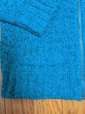 Pretty turquoise mixed with dark teal sweater. Two slip pockets in the front.