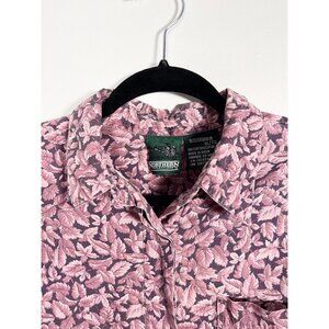 DESIGN - Northern Reflections button up long sleeved shirt with front pocket and collar. With pink and mauve leaf motif.