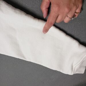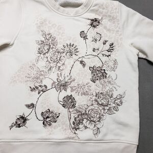 Adorable cream crewneck grandma sweater, featuring beautiful flowers / roses with some rhinestones / gems mixed it. Graphic has some crackling as pictured, a couple minor marks on the sleeves that I did not try to remove. Minor pilling.