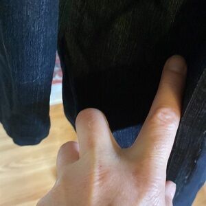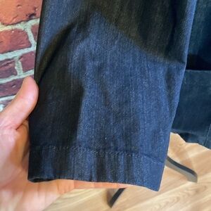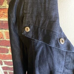 Very nice quality piece. It has buttons for a front closure and front pockets. There is a deeper pocket on the inside. It features 3/4 length sleeves. More of a slouchy loose fit. It’s in like new condition.