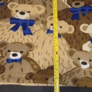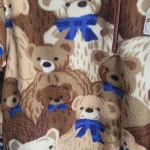 Super cozy vintage Northern Getaway fleece pullover featuring an adorable all-over teddy bear print with blue bows. Soft plush fleece with snap button neckline and adjustable drawcord hem. Classic 90s cabin / cozycore aesthetic.