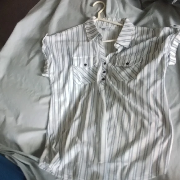 Stylish striped button-up blouse with a classic collar. Perfect for casual or office wear.