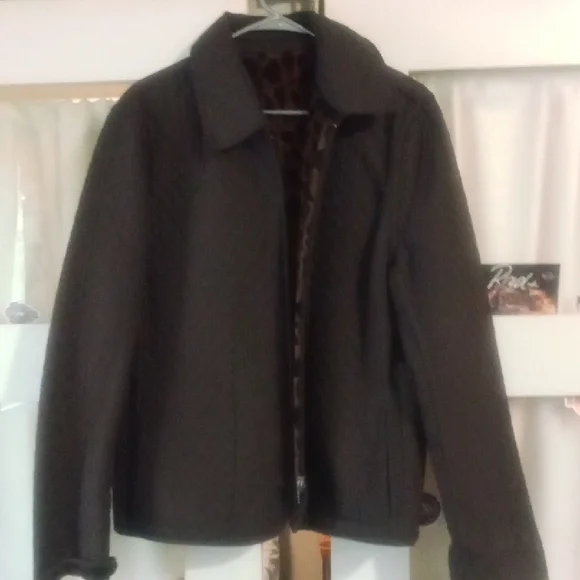 Stay stylish and warm with this sleek brown bomber jacket. Perfect for any occasion. Reversible to fluffy leopard print.