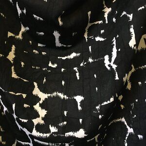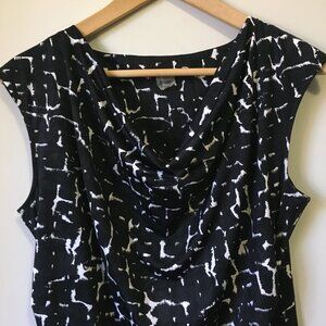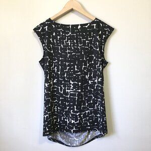 Very good preowned condition, fitted, ruched waist, stretchy, sleeveless, cascade/cowl neck tank top by Not Just Pants. Print is an unusual abstract black and white, ink or brush stroke like combination of square shapes. Fabric has a sleek, semi-shiny surface. Very cool.