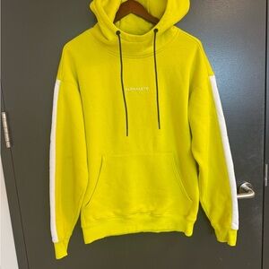 NOT FOR SALE ! M GUC almost excellent/ minor markings and wear last pic shows a minor markikb on sleeve. Bold yellow hoodie with white sleeve stripes. Features a front pocket and drawstring hood. Perfect for everyday comfort.