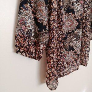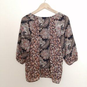 Notations intricate pattern printed ¾ sleeve blouse. The colors are pink on a black background. There are four buttons on the front of the blouse. Doesn't come with the material or washing content tag.